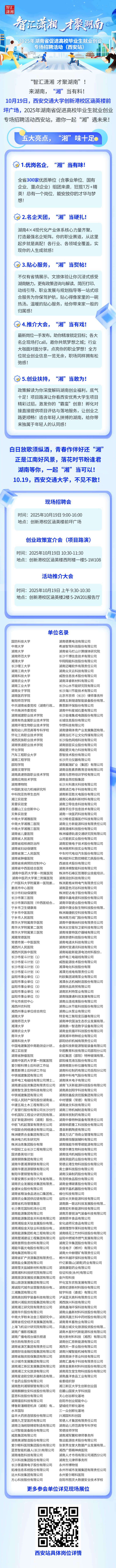 10月19日上午,西安交通大学创新港校区涵英楼前坪广场,2025年湖南省促进高校毕业生就业创业专场招聘活动西安站,邀你一起“湘”遇未来!